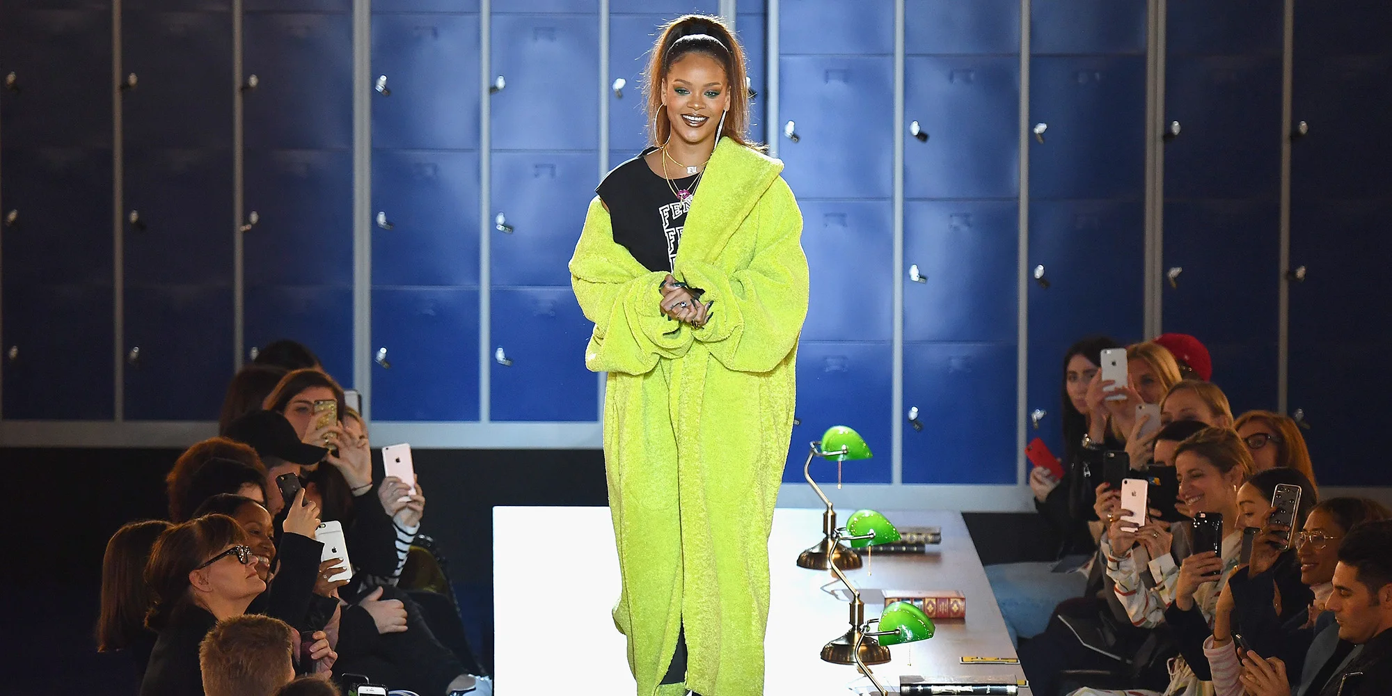 So, who says libraries are boring? At least, not the one’s Rihanna’s a part of. The Fenty x Puma Fashion Show reveals a library setting — long tables topped with neon green desk lamps, rows of lockers starkly lining the background and bookcases as far as the eye can see. Rihanna, however, sees the study area a little different than most… Tables turn into catwalks, and a models’ only test evaluates how well they strut their stuff in the latest Fenty x Puma. We see no better way to rejoice the end of the school year by making a stomping statement all over the tables! We for one, prefer Rihanna’s school of thought!